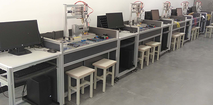 單片機控制功能實訓(xùn)考核裝置采用烤漆鋼板制作的臺式結(jié)構(gòu)。實訓(xùn)臺的抽屜柜用于存放實訓(xùn)模塊,抽屜柜與臺面之間布置實訓(xùn)模塊安裝支架,最上一層是工作臺臺面。用于技能競賽時在臺面上放置設(shè)備安裝底板,在底板上安裝試題擬定的單片機控制裝置需要的模塊,連接控制電路,編寫的控制程序輸入單片機后,按下運行指令開關(guān),單片機控制裝置就按程序運行。